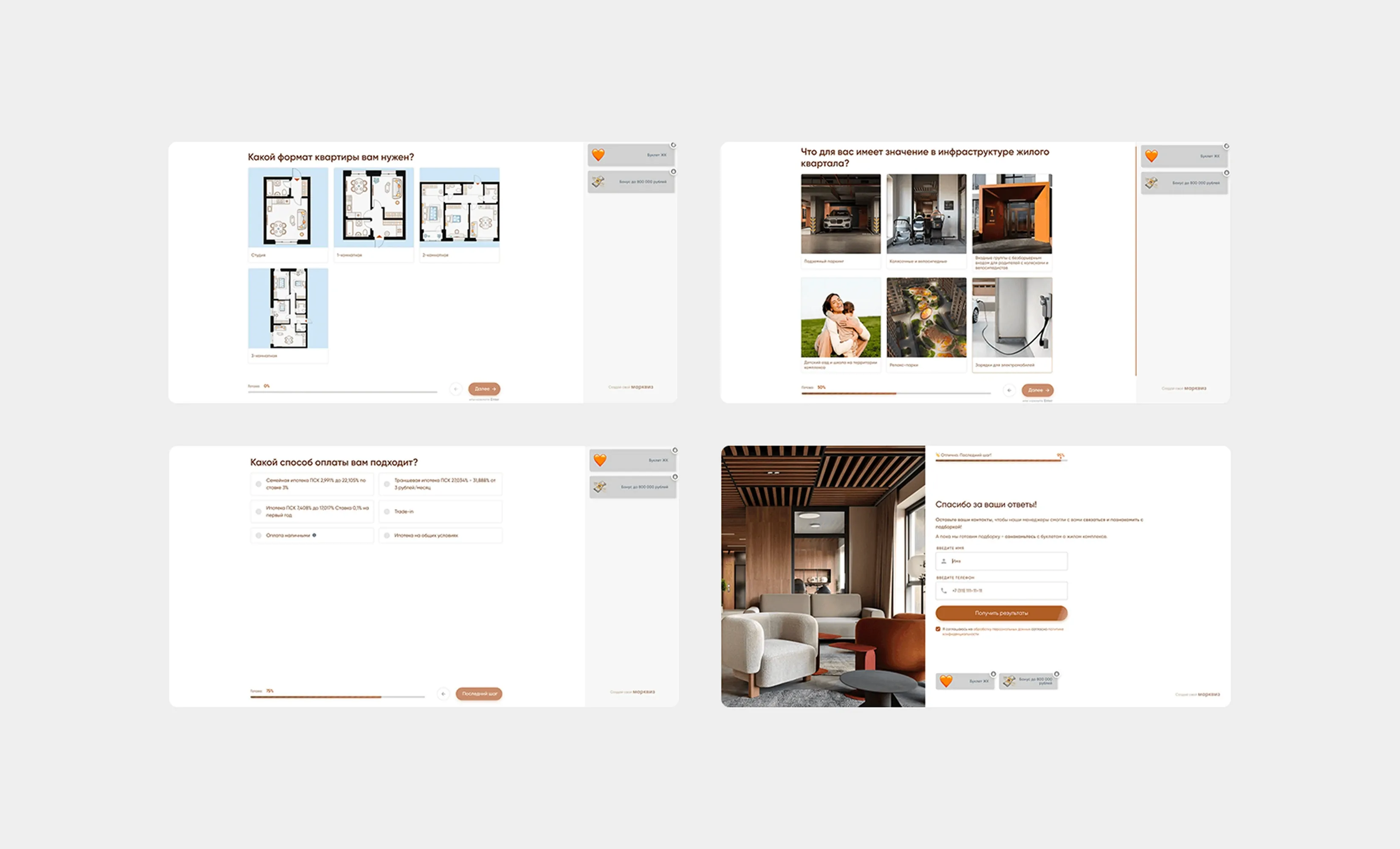 В качестве посадочных использовали и сайт застройщика, и квизы — они помогали выявить потребности клиента: комнатность, инфраструктуру ЖК.