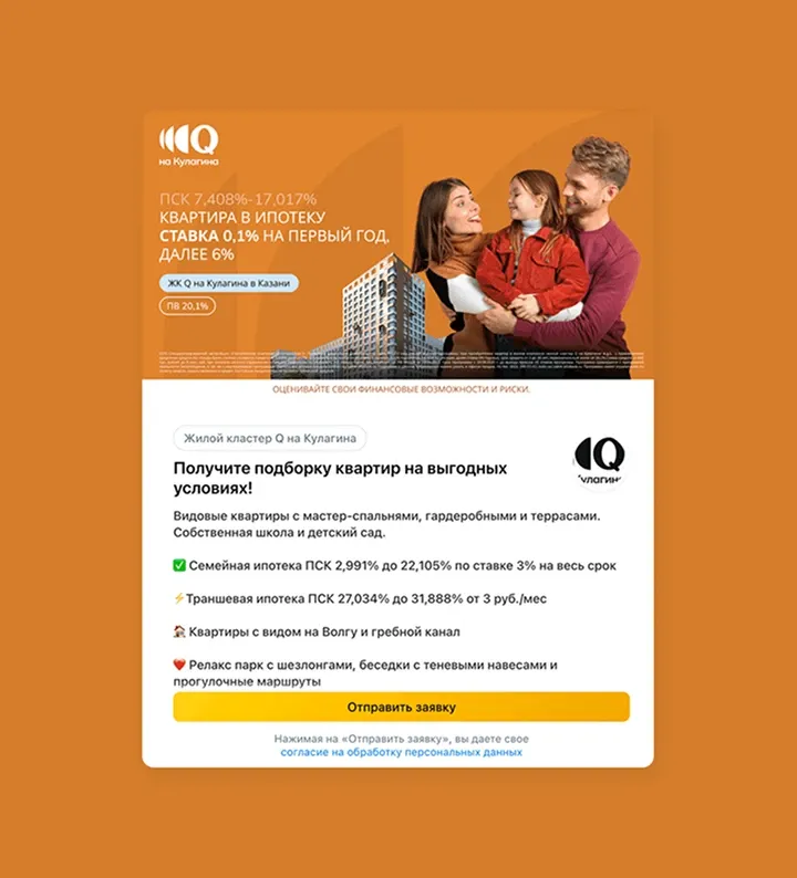 В РСЯ добавили карусель из изображений планировок в стилистике ЖК и настроили оптимизацию по микроцели «дошёл до формы контактов».