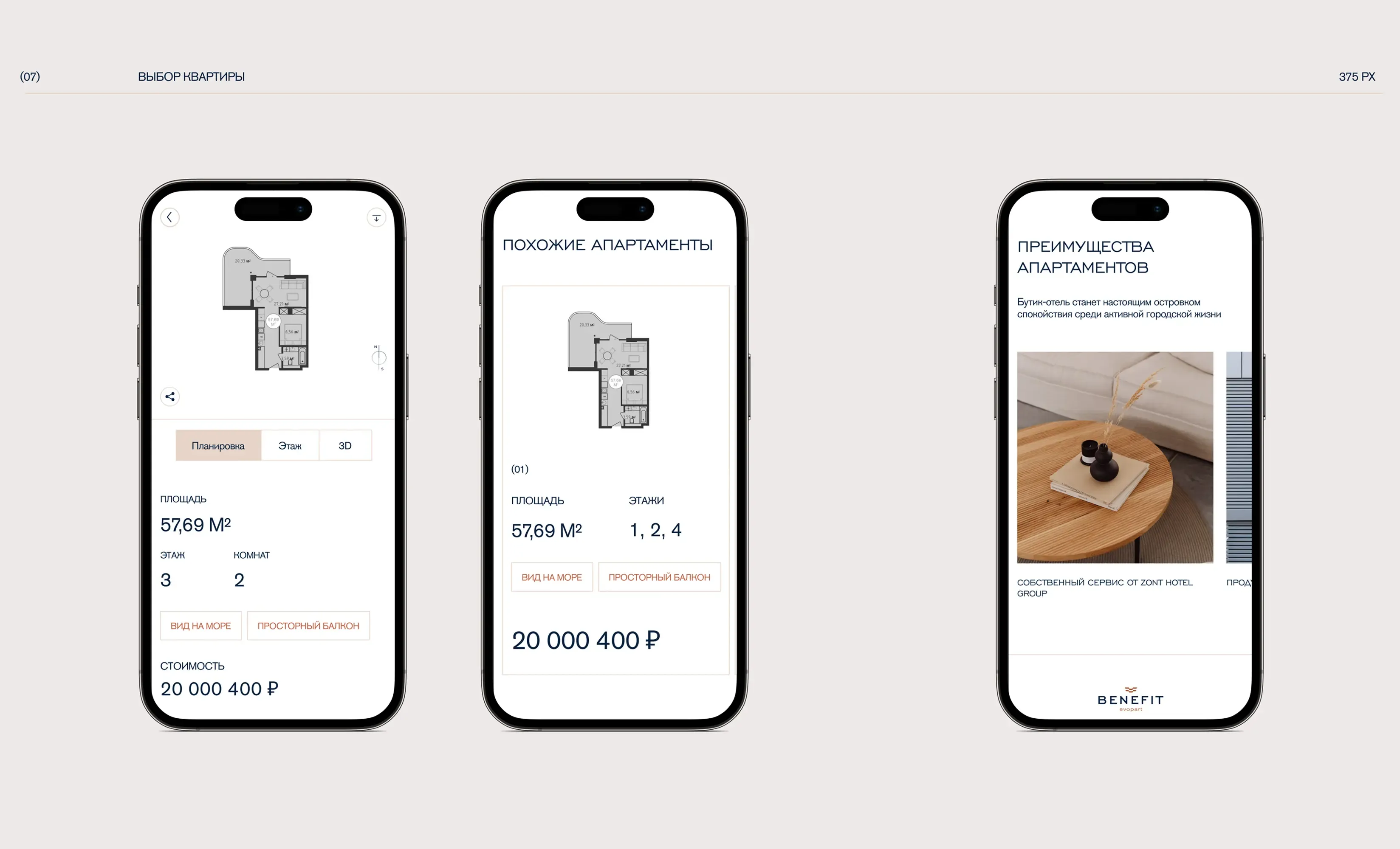 Плавные анимации, обилие воздуха и лаконичность помогают передать ощущение премиальной жизни у моря