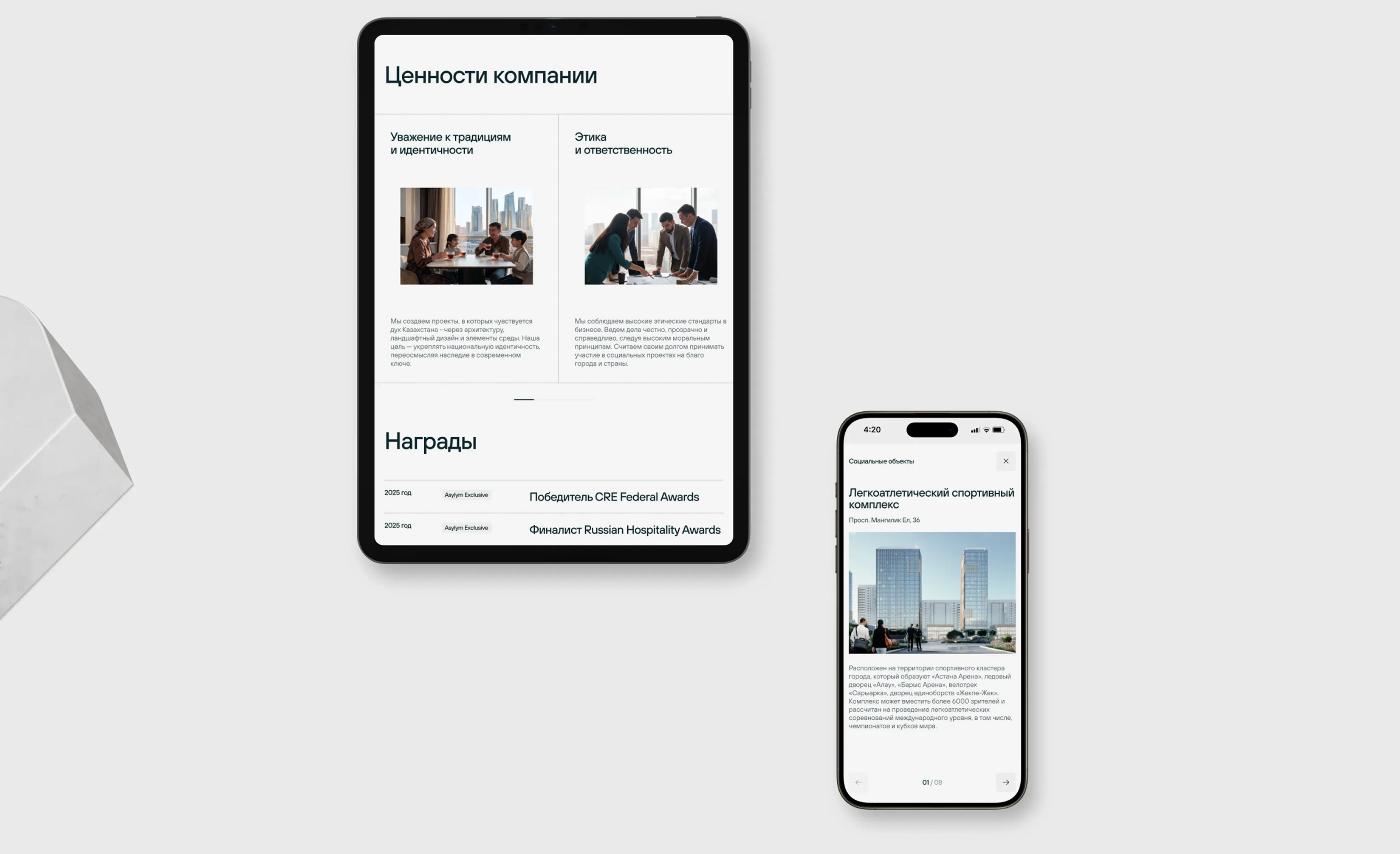 Эту же идею мы продолжили в дизайне сайта: сделали чистый интерфейс в светлых оттенках с национальными мотивами, а идею баланса и равновесия отразили в центральной осевой линии.